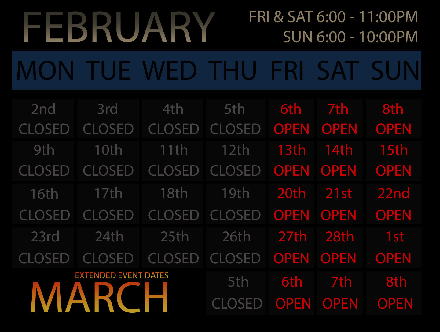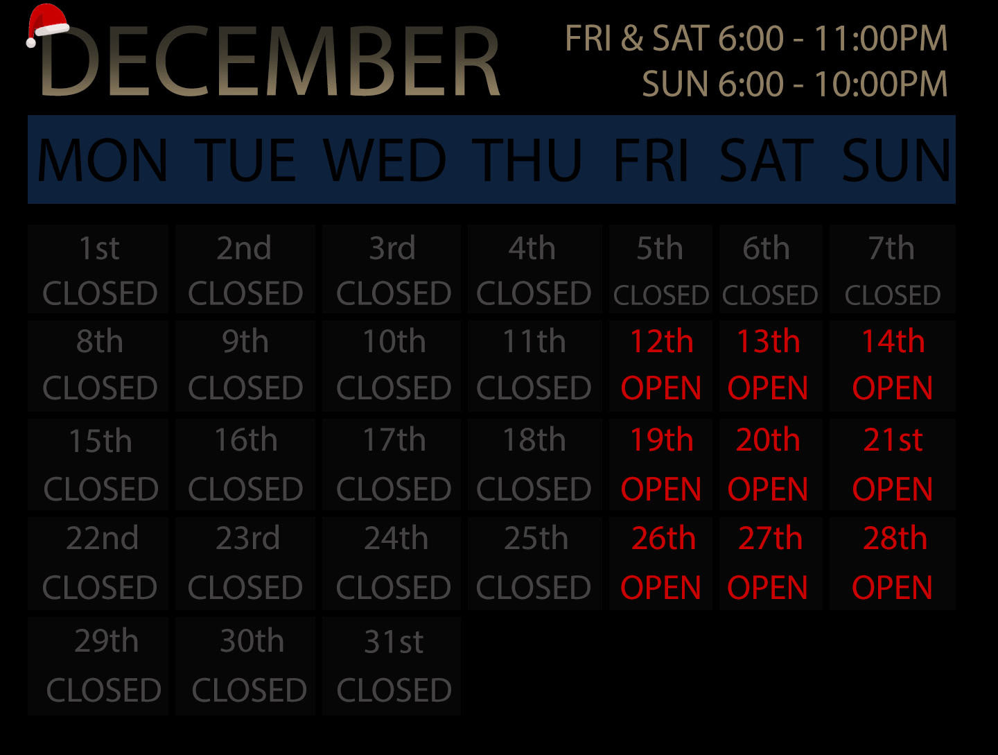 Friday & Saturdays: 6:00 PM - 11:00PM